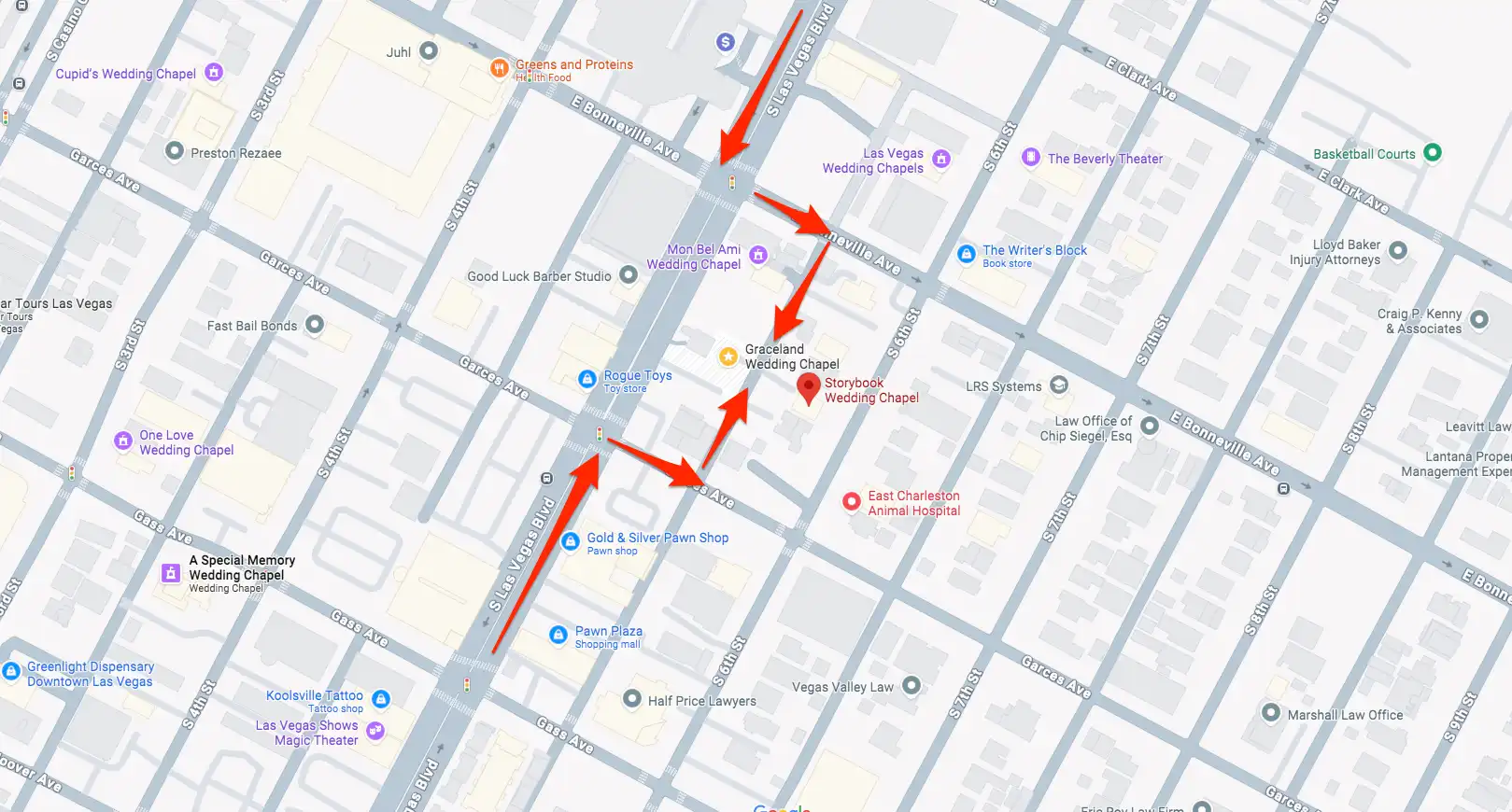 Traveling from the South end of the Strip, such as the MGM Grand, Bellagio, or Wynn Hotel, please travel North on Las Vegas Blvd, turn right on Garces, and then turn left into the first alley, in between Las Vegas Blvd. and 6th Street. The parking lot will then be on your right side.